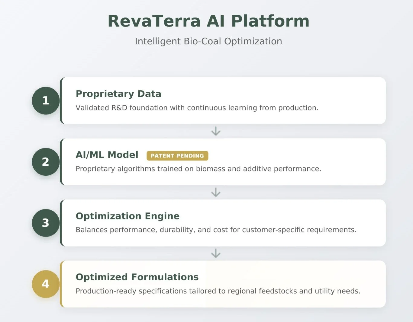 RevaTerra delivers AI-powered renewable carbon fuels that replace coal in power and industrial energy systems. Our proprietary platform optimizes biomass chemistry, feedstock sourcing, and process control to create a high-energy, carbon-neutral fuel. While the format uses bio-coal, the true product is our AI-powered system that transforms waste streams into value streams and enables scalable decarbonization.
